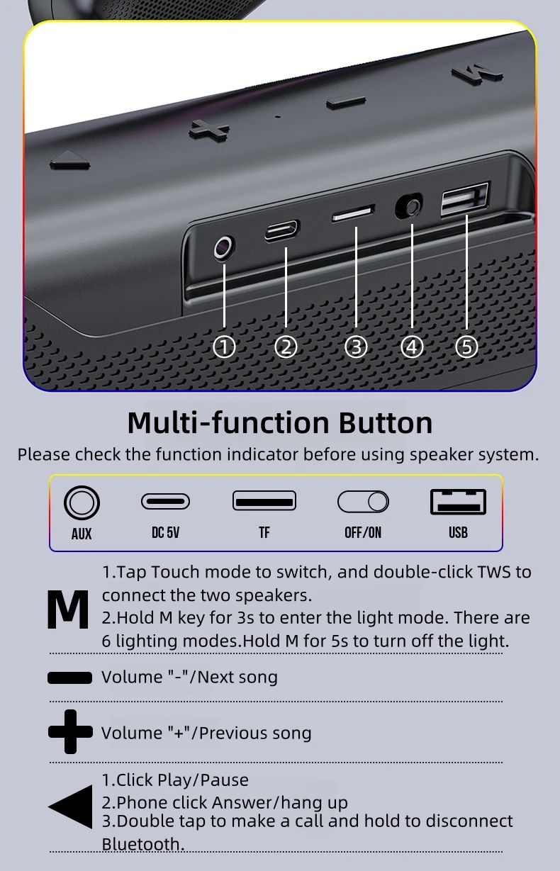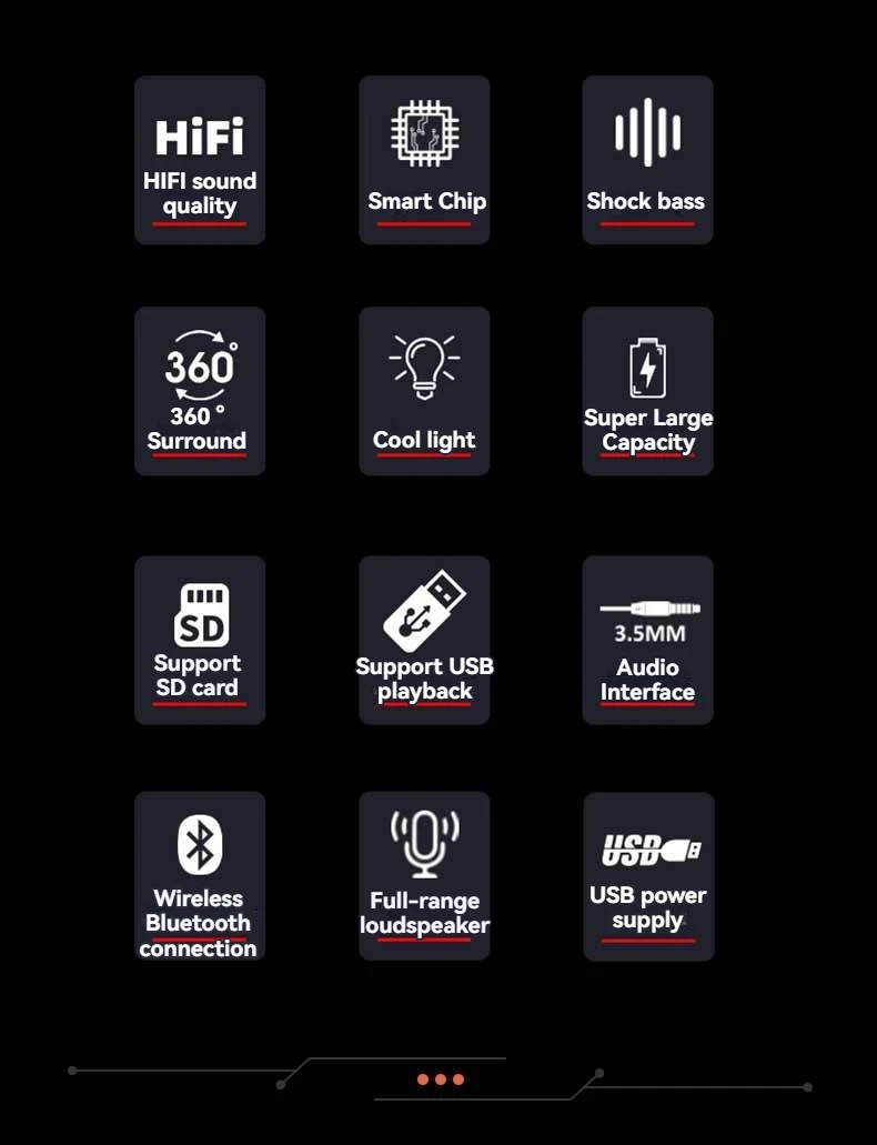 Function : Support BT / TF Card / USB Drive / AUX-In / RGB Light / TWS